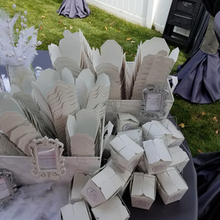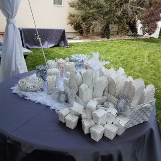 I put together this candy buffet for a "Fun and Fancy" outdoor wedding. The guests enjoyed pizza and salad from food trucks and some sweets on the side for dessert. The bride wanted a little bit of glitz, a lot of feathers, and food take out boxes for guests to fill with the candy from the buffet.